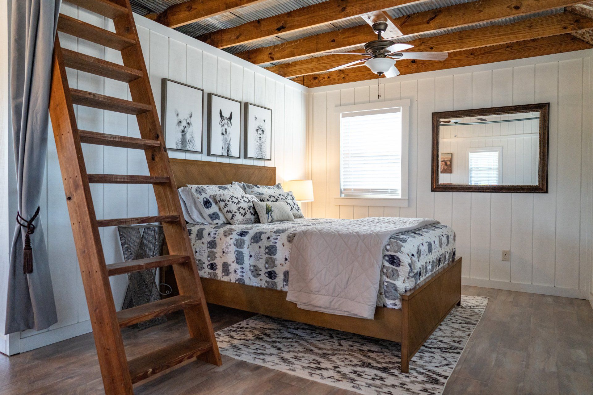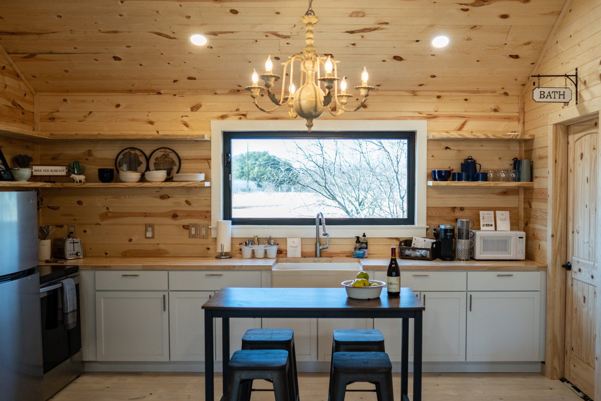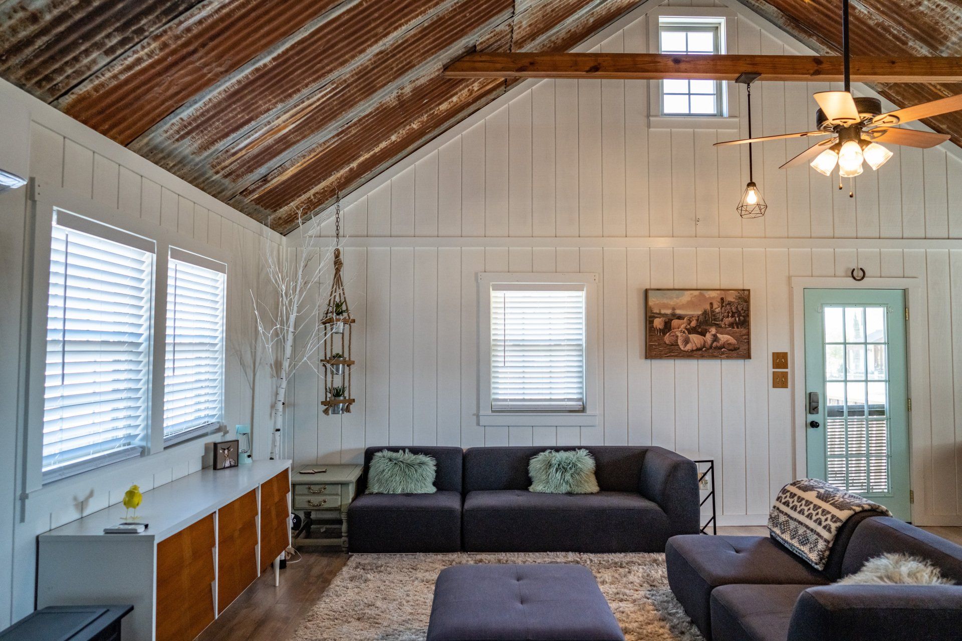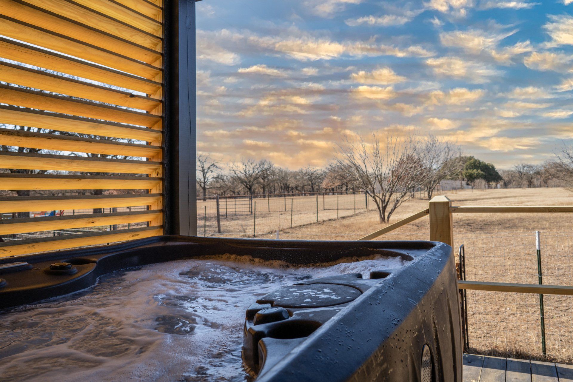 A texan-chic farmhouse, featuring rustic yet modern finishes. This accommodation beholds an open floorplan with full kitchen, queen bedroom, loft with two twin beds, hot tub, and large porch to watch the sunset and farm animals.