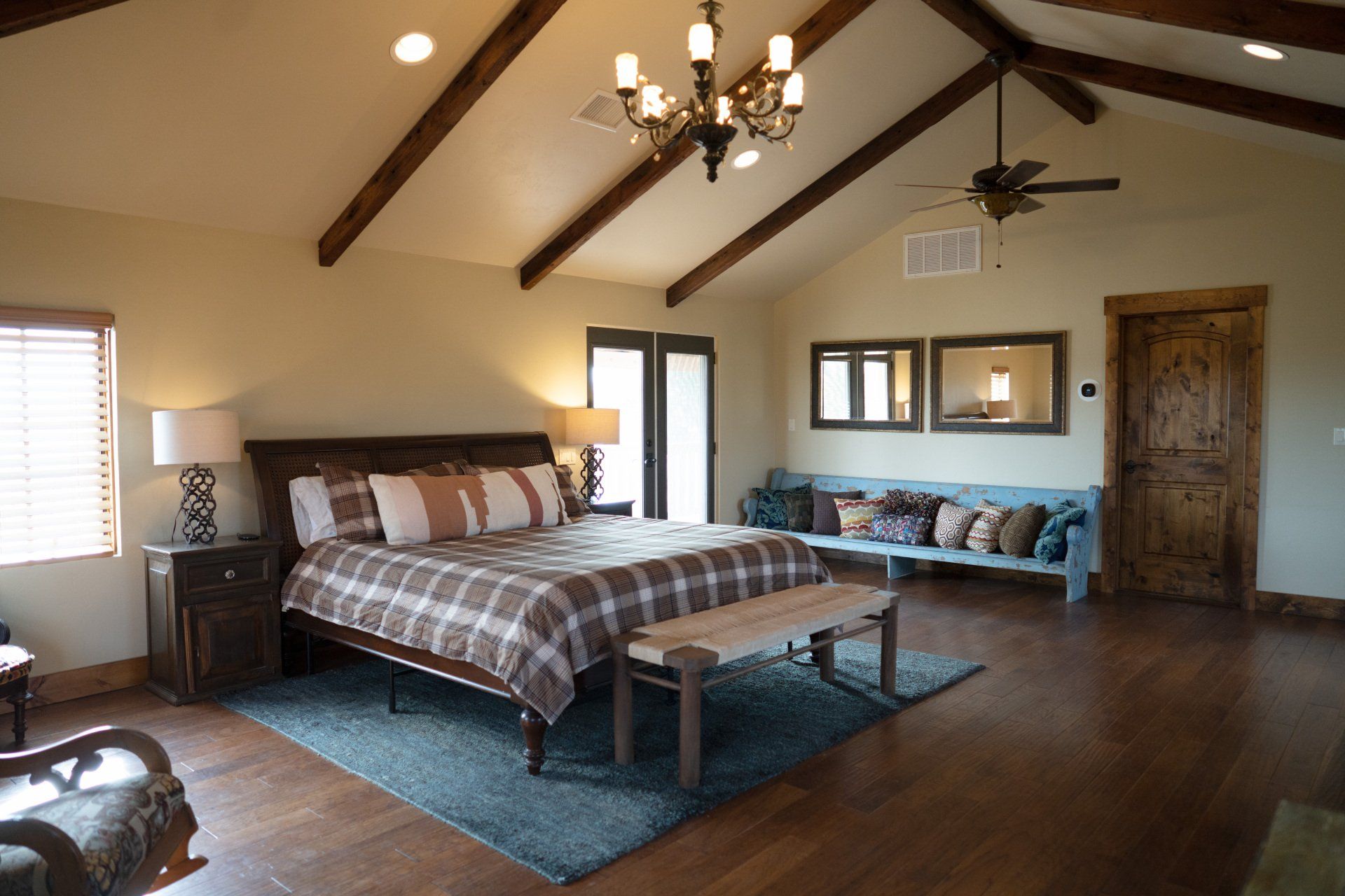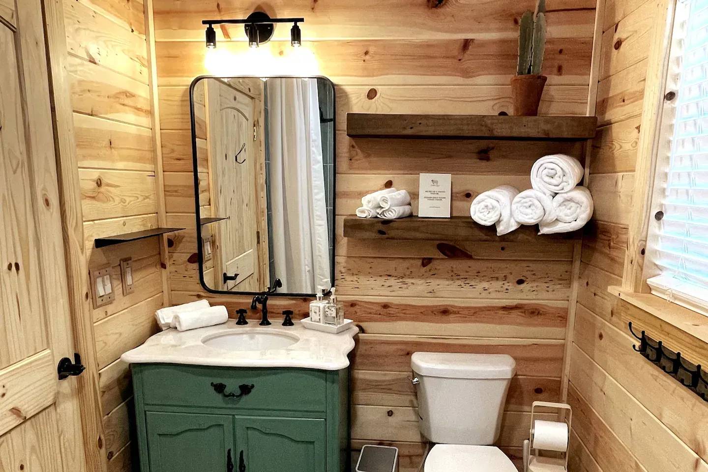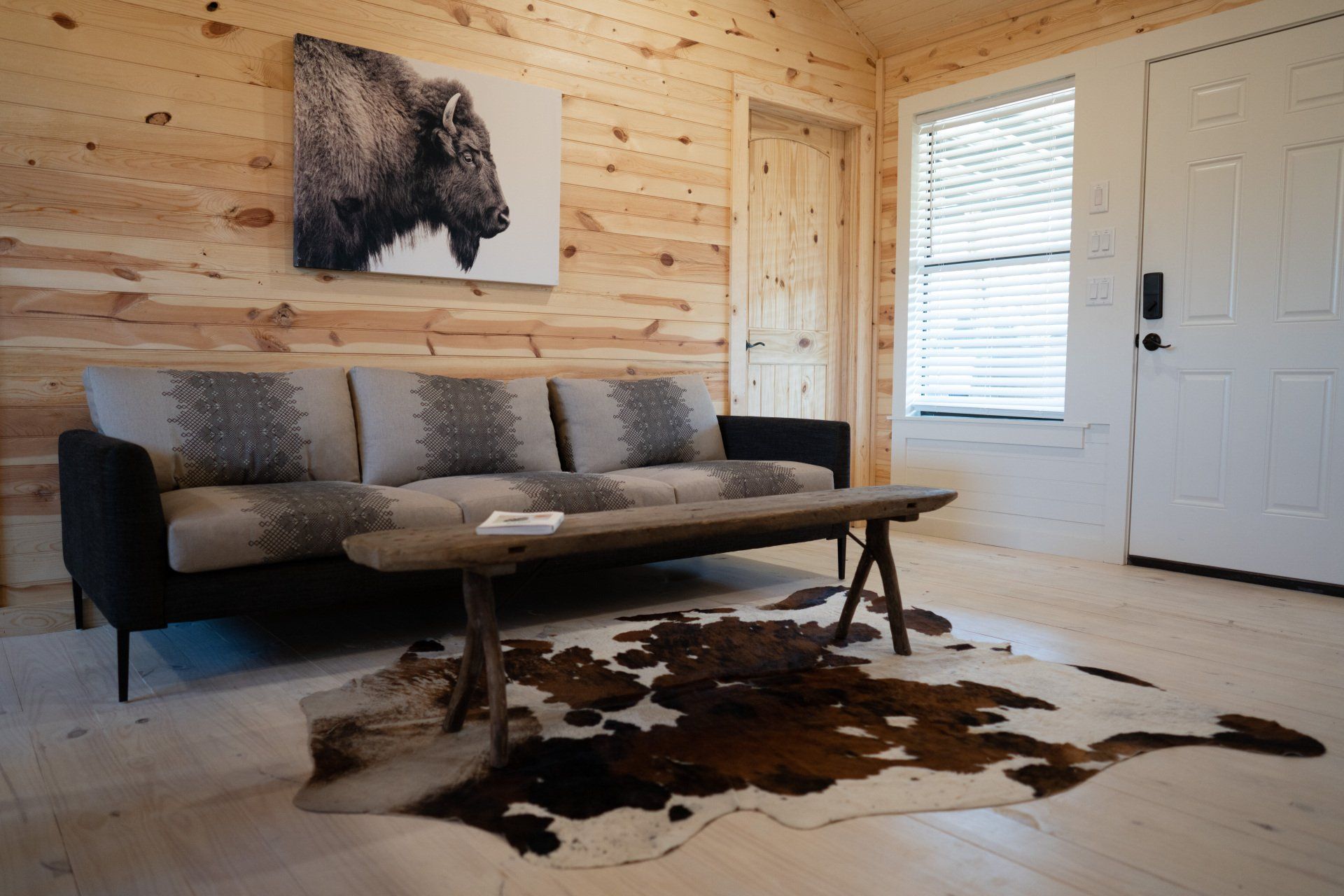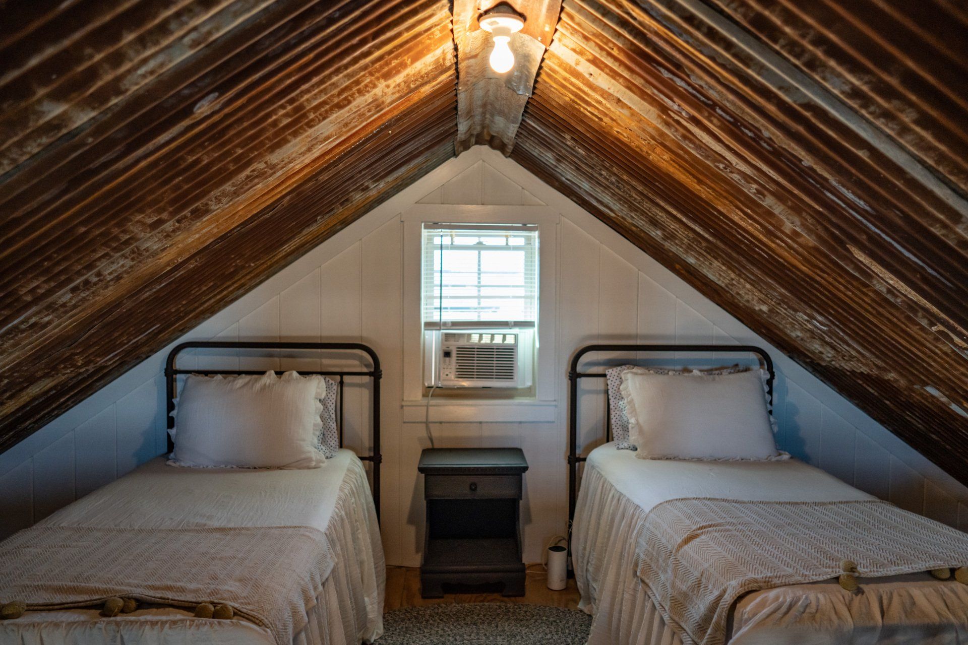 A texan-chic farmhouse, featuring rustic yet modern finishes. This accommodation beholds an open floorplan with full kitchen, queen bedroom, loft with two twin beds, hot tub, and large porch to watch the sunset and farm animals.