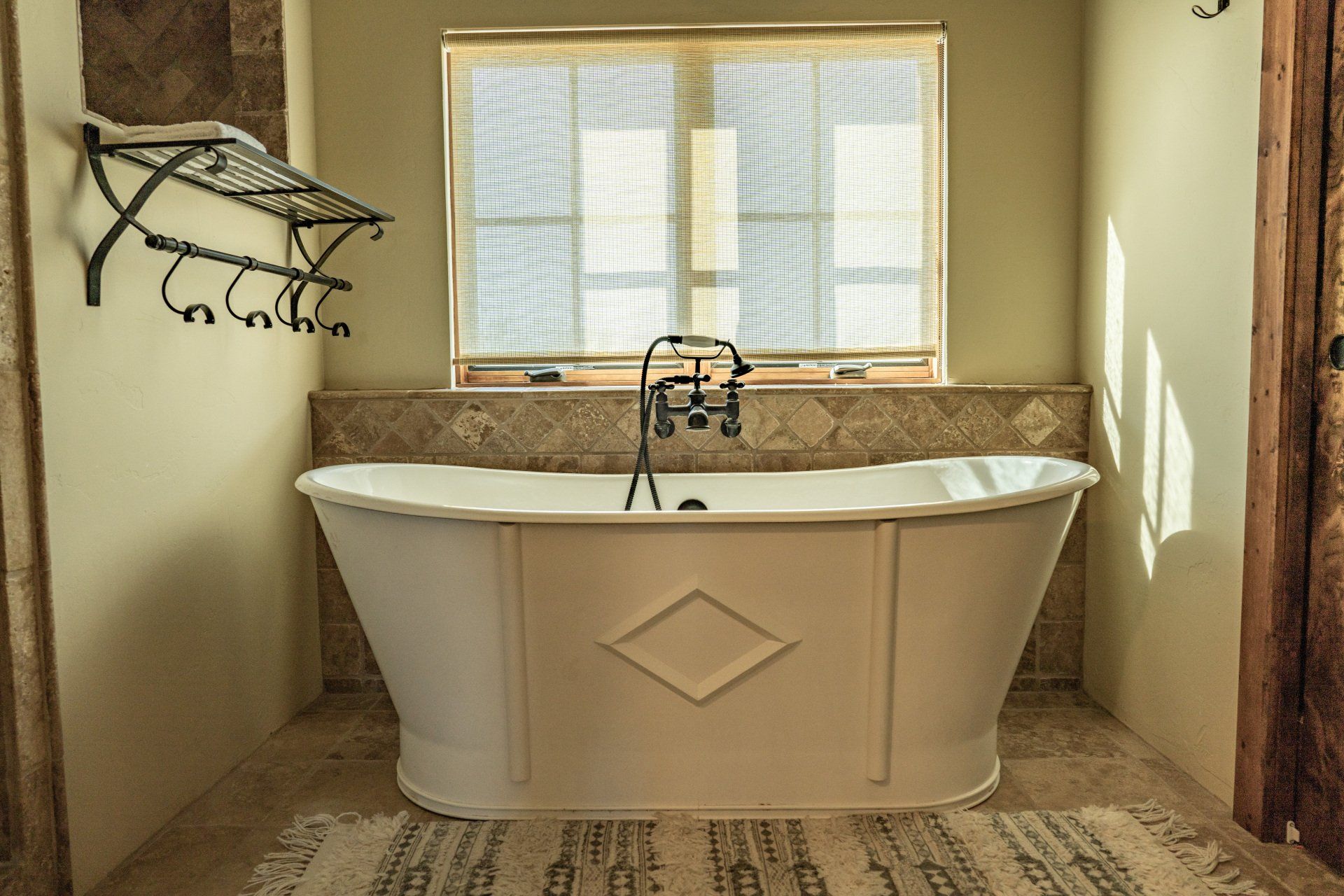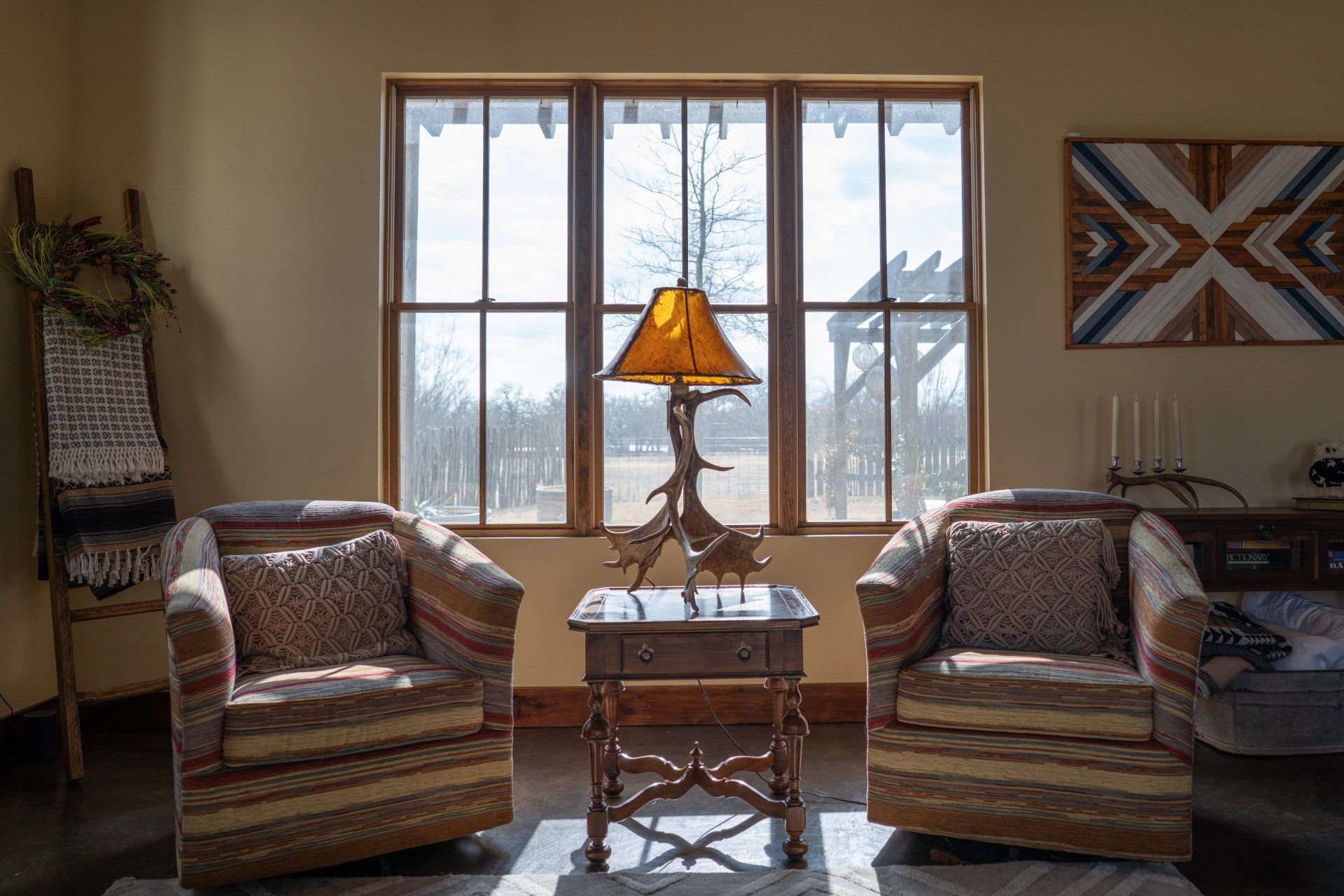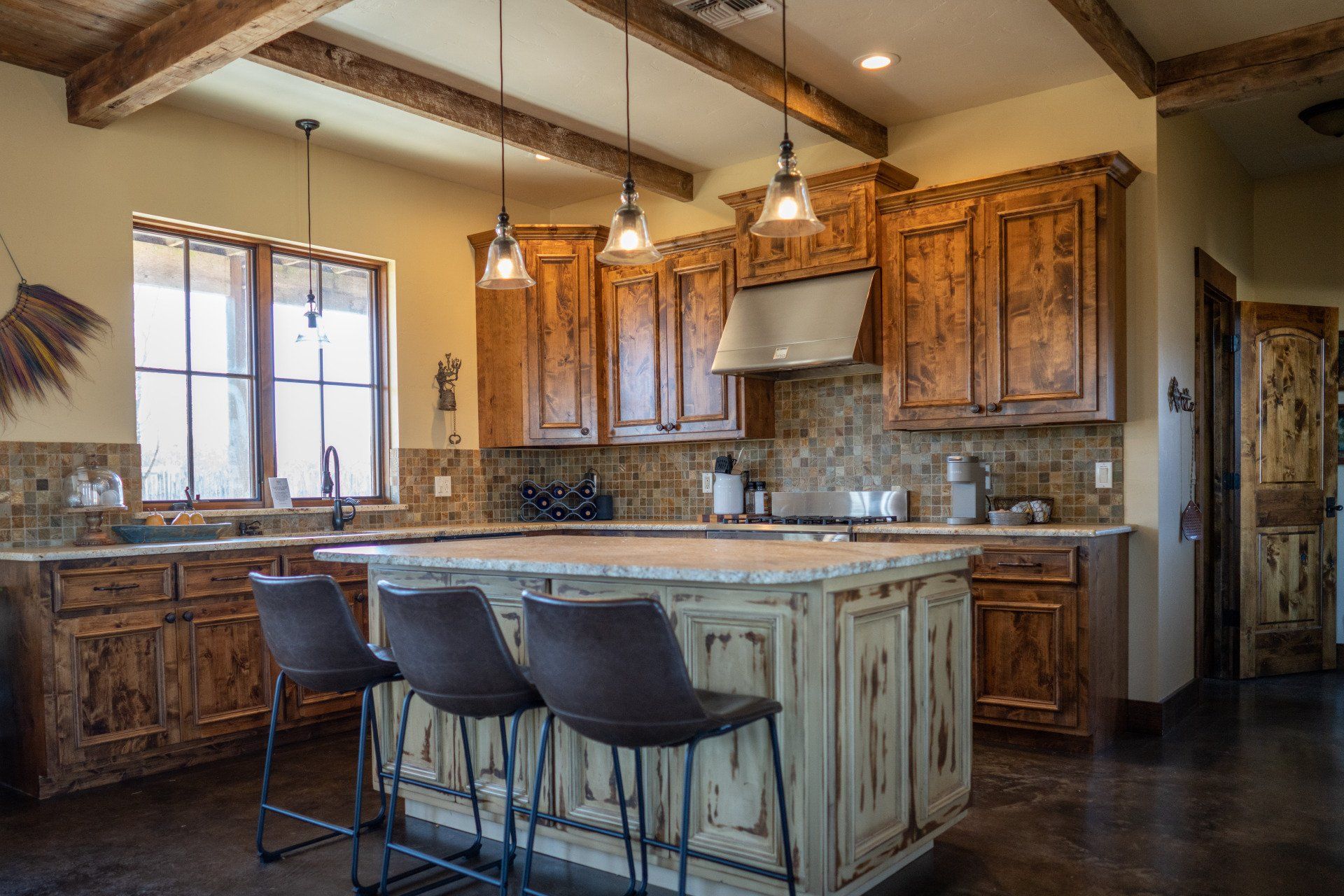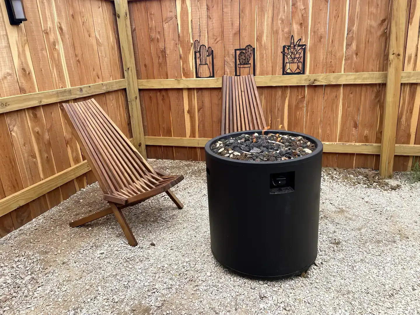 A texan-chic farmhouse, featuring rustic yet modern finishes. This accommodation beholds an open floorplan with full kitchen, queen bedroom, loft with two twin beds, hot tub, and large porch to watch the sunset and farm animals.