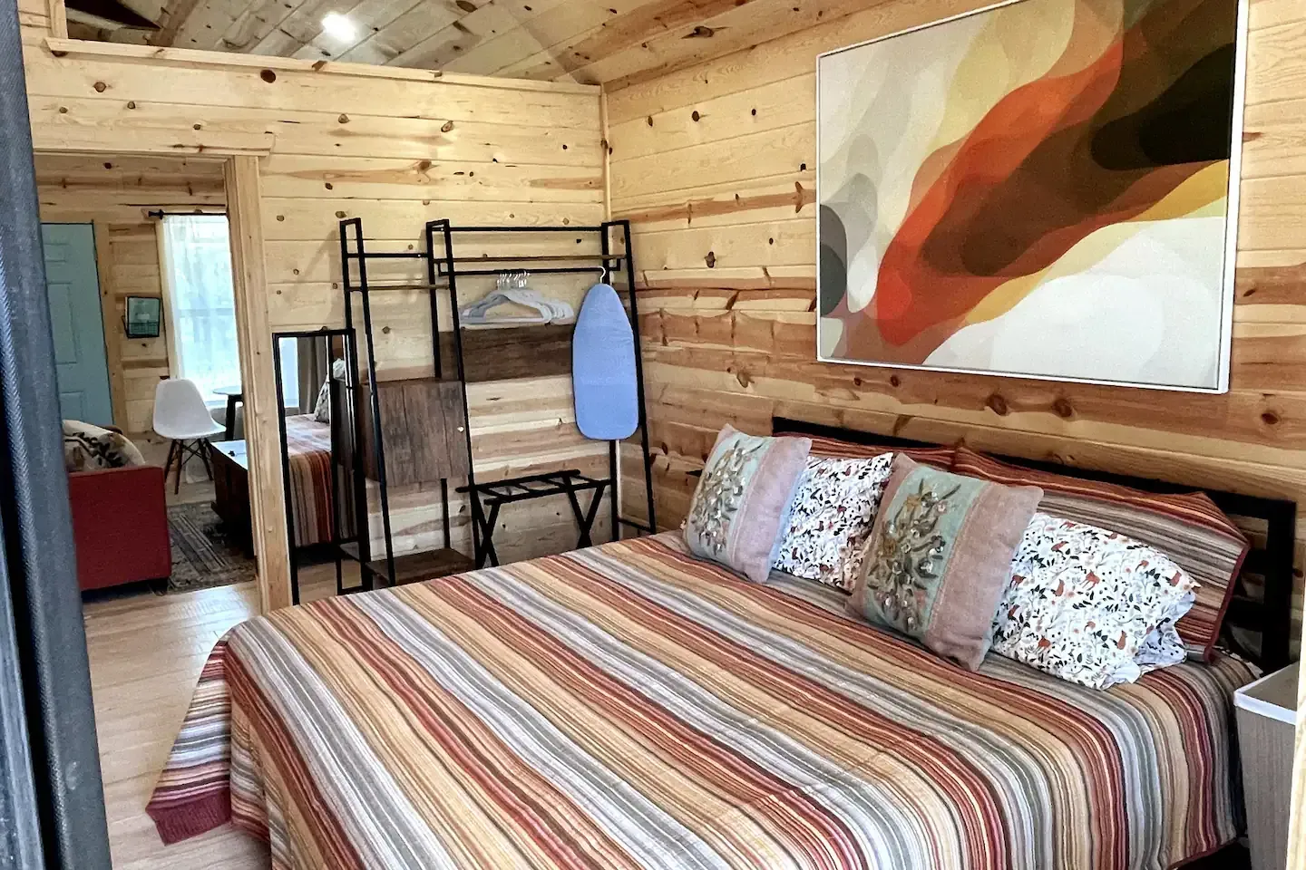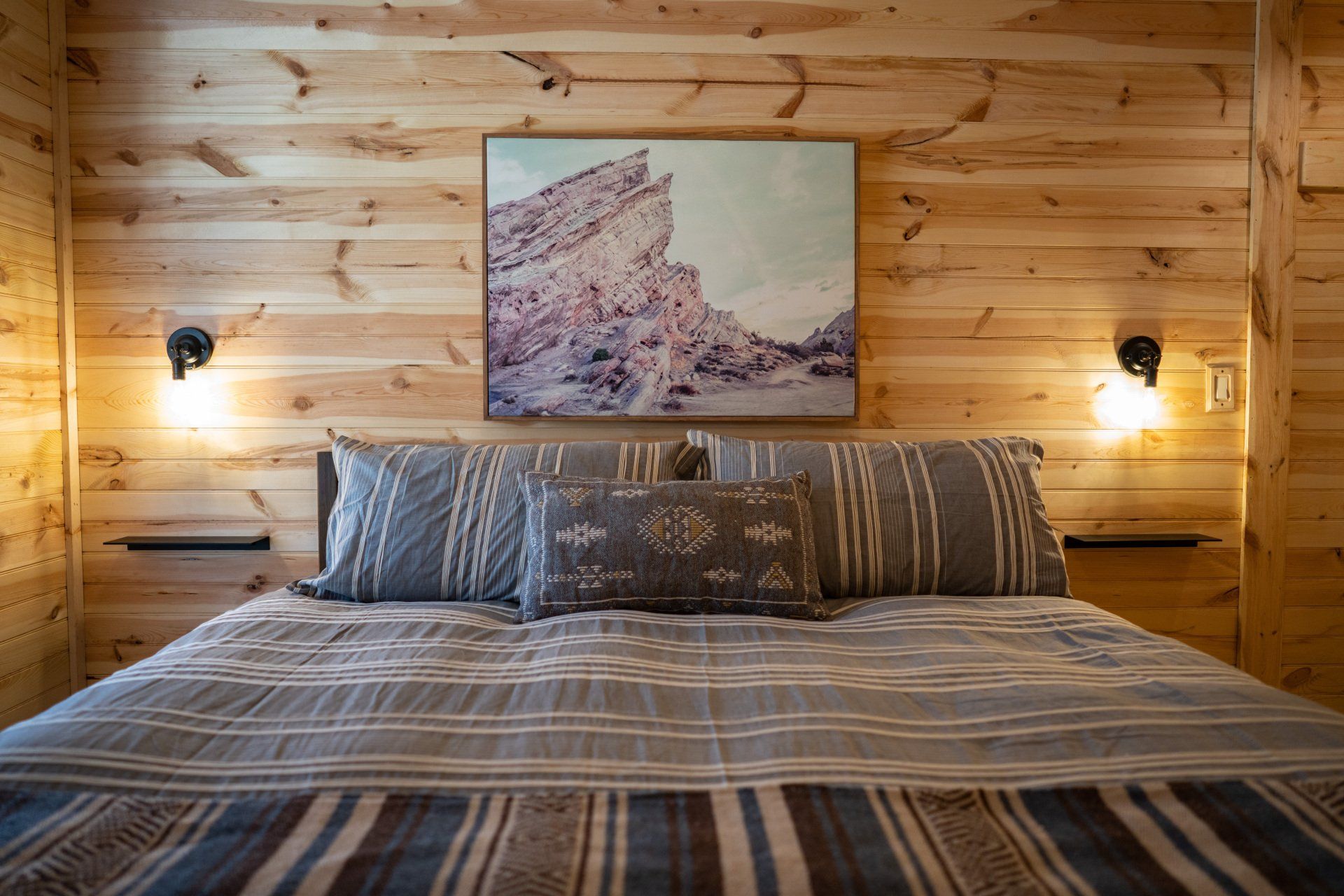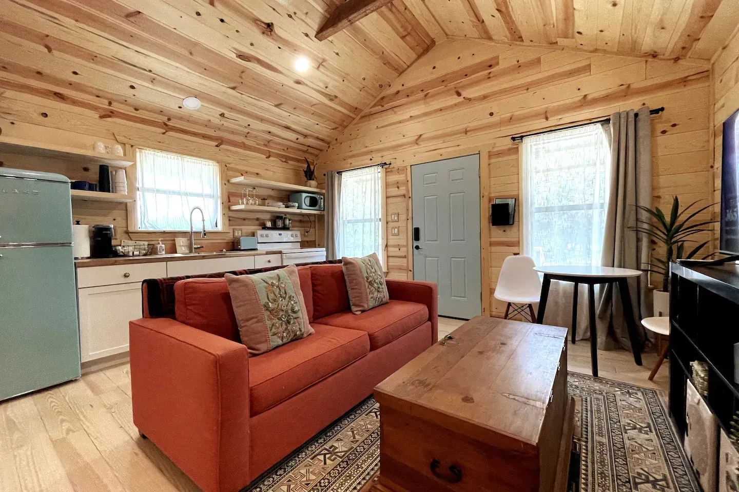 A pure cedar cabin, featuring a modern efficient floor-plan featuring two master bedrooms. The cabin features an open kitchen, living area with tv, and master bathroom with a large walk-in shower. This accommodation boasts a large outdoor porch with seating, a hot tub, and a fire pit.